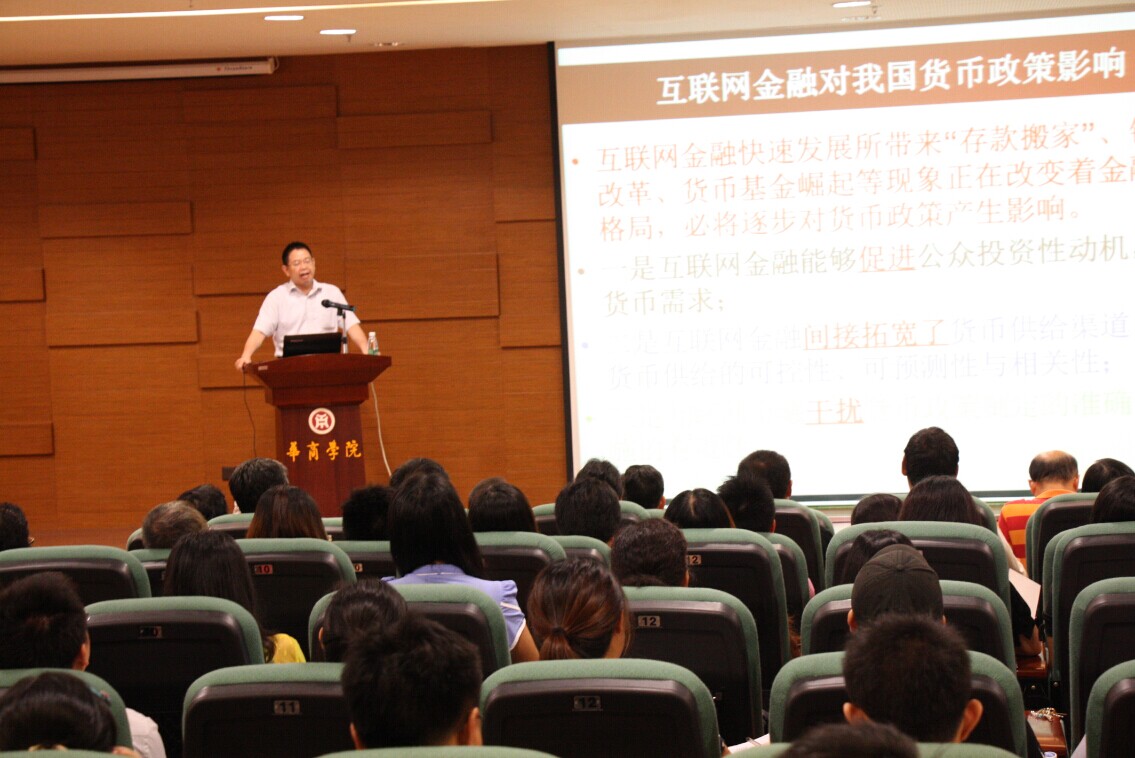 7月18日,我院邀请了广东财经大学金融学院院长邹新月教授在图书馆报告厅为我院教师作了题为“互联网金融对我国货币政策影响分析”的专题讲座。本次讲座是“华商论坛”的系列讲座之二。苏宁书记、支戈壁副院长、邓基泽副院长、郭银华副院长、王中德副院长、副科级以上干部、高级职称教师以及教师代表参加了讲座,讲座由支戈壁副院长主持。