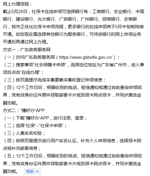 截止5月28日,社保卡在线申领可选择银行有:工商银行、农业银行、中国银行、建设银行、光大银行、广发银行、广州银行、招商银行、农商银行,我市正优化社保卡申领流程,更多银行的在线申领将于5月中旬前陆续开通。如您现在需选择其他银行为服务银行,可待该银行的网上申领业务开通后再通过网上办理。