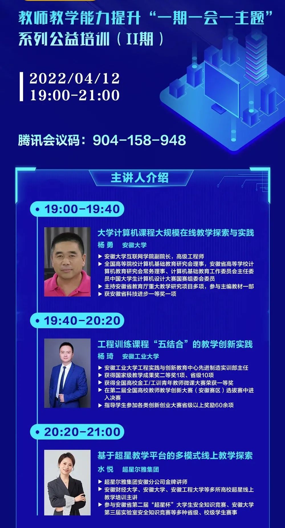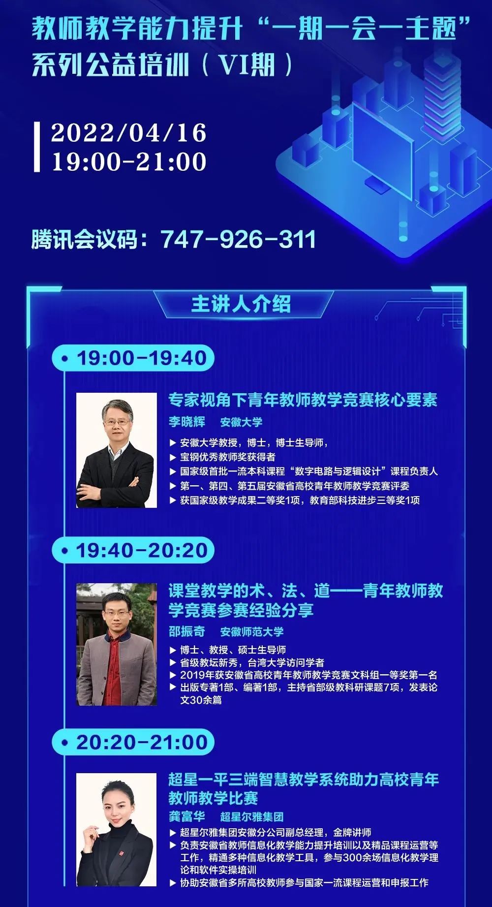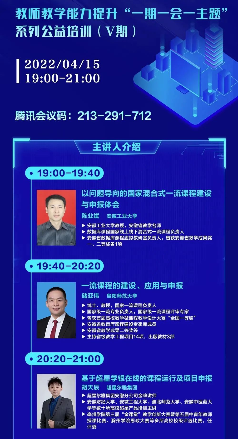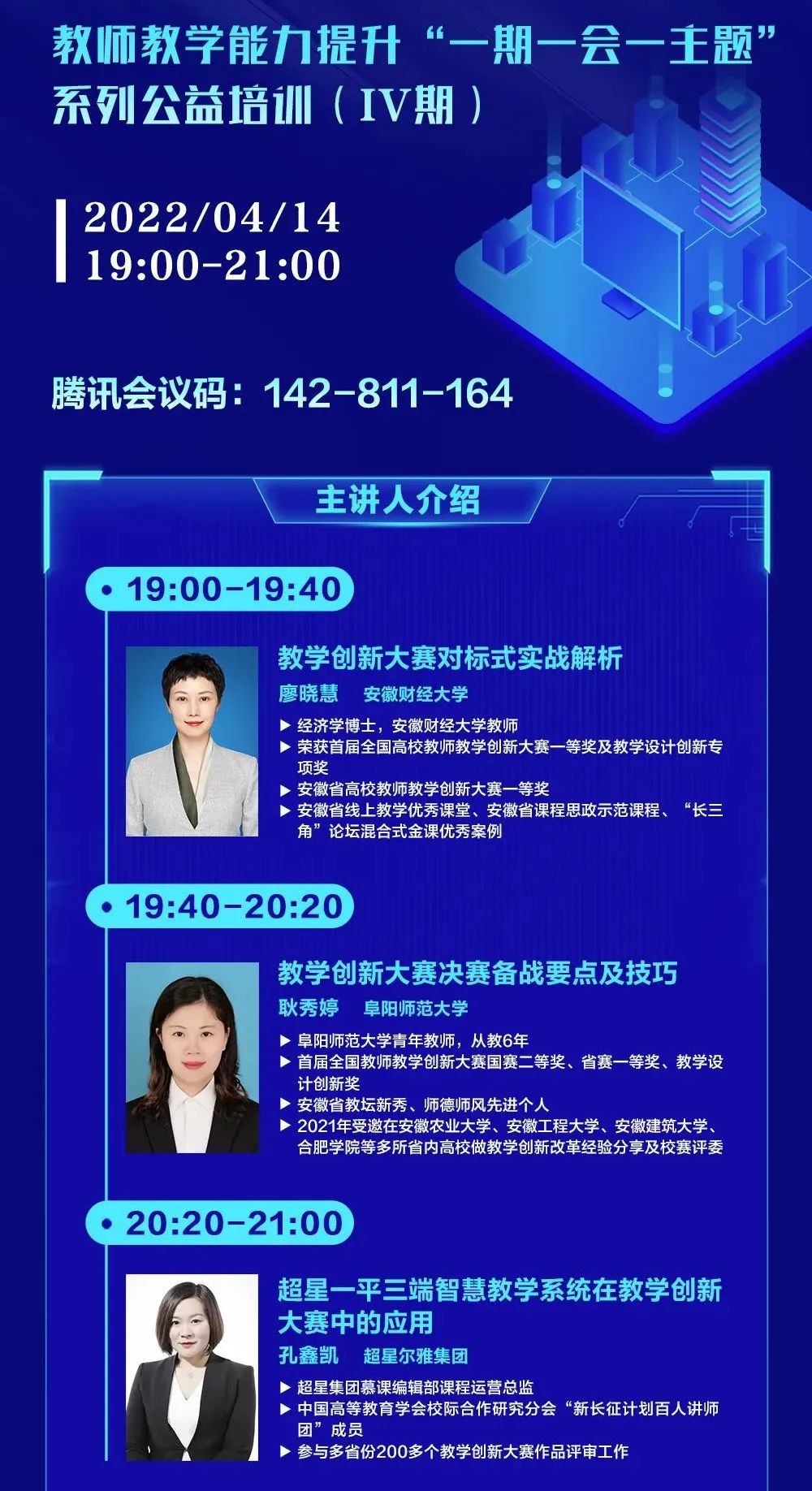 在电脑端/手机端下载腾讯会议,按照直播安排表输入会议码,参与每场培训的直播与互动。