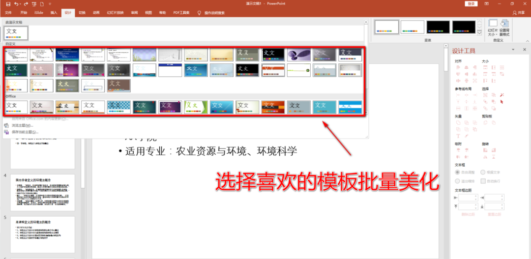 在“设计”选项卡的主题栏中,选中需要的模板。可以为所有PPT应用该主题。