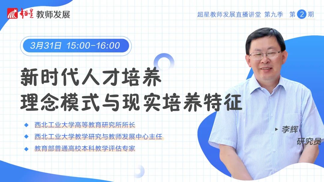 超星教发直播讲堂第九季第2期邀请西北工业大学高等教育研究所所长李辉,分享人才培养的理念、模式、改革与实践路径。