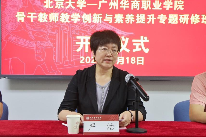 首先,北京大学政府管理学院副院长严洁教授致开班辞,她指出,本次研修班是贯彻落实党的二十大精神,加强高校教师队伍建设的重要举措,对于提升教师教学创新与素养,推动教育教学改革具有重要意义。她希望各位老师珍惜这次学习机会,认真学习,积极思考,不断提升自身的教学水平和综合素质。
