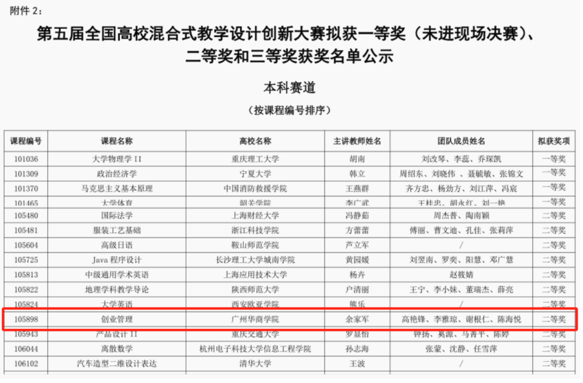 根据《关于举办第五届全国高校混合式教学设计创新大赛的通知》要求,经学校遴选推荐、大赛组委会评审、公示等环节,我校《创业管理》课程荣获第五届全国高校混合式教学设计创新大赛二等奖。