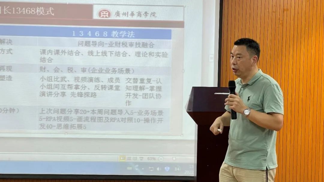 接着,由郑朝亮副教授进行《RPA 财务机器人》课程的分享。郑老师首先从智能化专业的设置初心开始谈起,深刻的分析了国内现行智能化会计专业的发展趋势,随后展示了RPA机器人的课程发展历程,并结合课堂中学生操作的实际案例为各位老师生动易懂的介绍了《RPA 财务机器人》的相关课程内容、课程目标以及教学方式。他提出了一个导向,三个结合,四个场景,六个活动以及八个步骤的教学相长“13468”的新模式,致力于切实解决学生们的学习问题。同时,郑老师还明确指出在这种智能化课程的授课中,老师和学生之间应当是相互学习的关,教学模式应当是一个以学生为主、老师为辅的启发式学习。