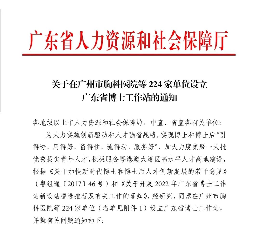 近日,广东省人力资源和社会保障厅发布《关于在广州市胸科医院等224家单位设立广东省博士工作站的通知》,我校成功获批设立广东省博士工作站。