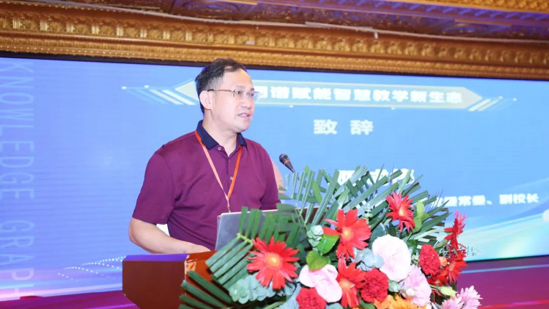 阳成伟在致辞中代表华南师范大学对莅临大会的各位领导、专家和老师表示热烈的欢迎。他强调,高校应把握数字化转型机遇,以知识图谱等为代表的人工智能工具为抓手,推动课程与专业的创新升级,构建跨学科的智慧教学新生态,深化“四新”建设,实现教学与人才培养的全面优化。他表示,华南师范大学愿与全国高校共建共享,加强数字化建设与教育研究,推动智慧教学创新,共同促进高等教育高质量发展。