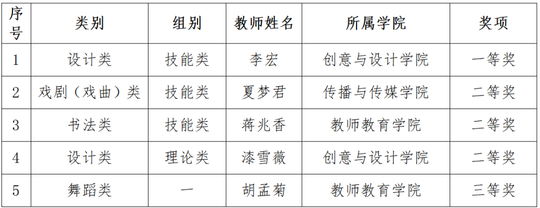 在广东省第二届高校美育教师教学基本功比赛中,我校推荐的五位教师凭借精湛的教学技艺和深厚的艺术底蕴,在全省近140所高校、674名优秀参赛教师中脱颖而出,荣获一等奖1项,二等奖3项,三等奖1项,涵盖舞蹈、戏剧(戏曲)、书法、设计四大艺术领域。