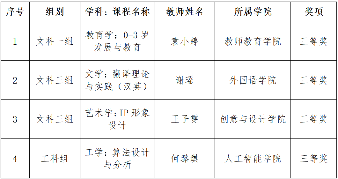 在广东省第七届高校(本科)青年教师教学大赛中,我校袁小婷、谢瑶、王子雯、何璐琪四位教师凭借扎实的教学功底、新颖的教学设计和生动的课堂展示,在众多参赛者中脱颖而出,均获得三等奖。