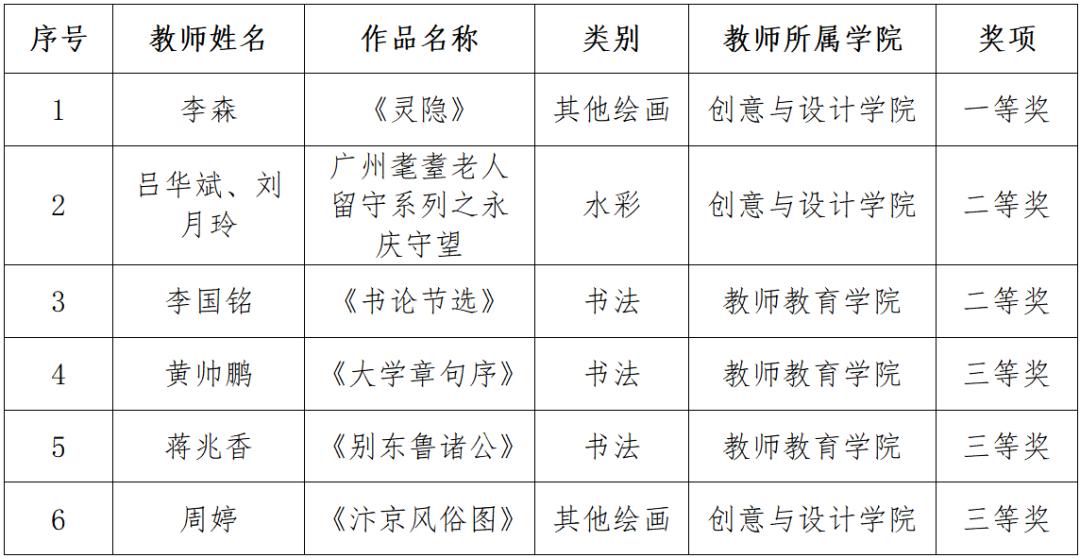 根据《广东省教育厅关于举办第七届粤港澳大湾区学校美术作品展暨第九届广东省高校美术作品学院奖双年展的通知》的安排,我校积极组织教师参与,涵盖了书法、绘画、水彩等多个领域,经省级复赛、现场评审,我校六位教师荣获一等奖1项,二等奖2项,三等奖3项。