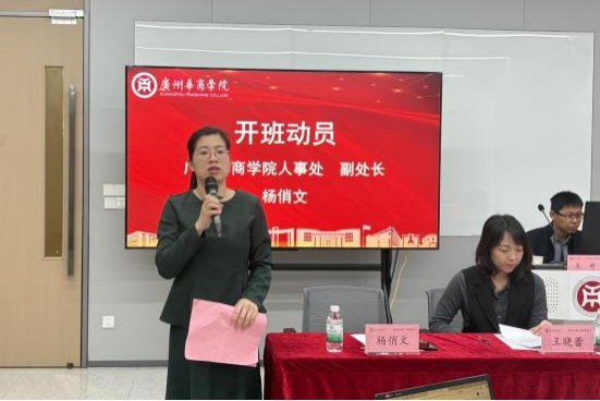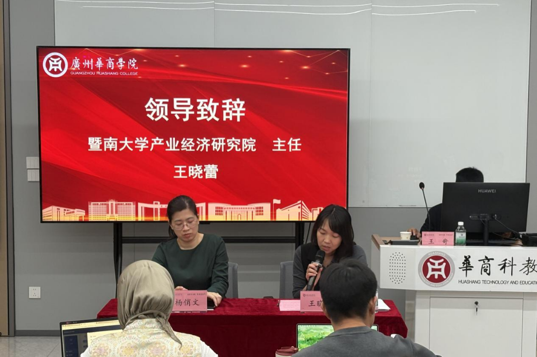 10月28日早上,暨南大学产业经济研究院主任王晓蕾、广州华商学院人事处副处长兼教师发展中心主任杨俏文出席开班仪式并致辞。