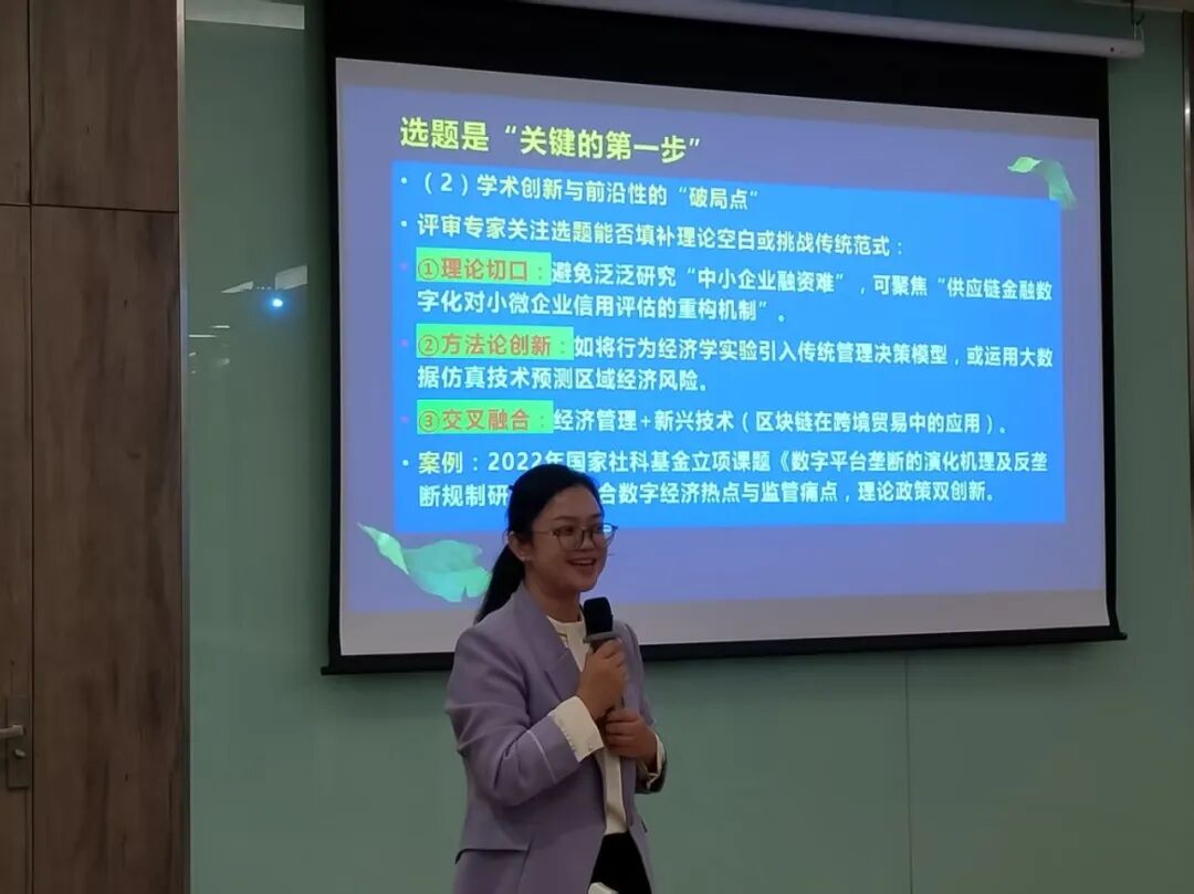 数字金融学院颜淑蓉教授以《科研项目申报的几点体会》为题带来深度分享,从认知重构、选题策略、论证技巧到心态修炼,为在场教师拆解科研申报核心逻辑:她提出申报是价值呈现而非求资助,需以申报书为产品说明书向“客户”(国家)展现研究价值;选题要紧扣“新质生产力”“数字经济”等政策热点与学术前沿,通过跨学科融合打造创新“破局点”,同时衔接团队前期成果构建差异化竞争力;论证环节需遵循黄金圈法则,先答“为什么做-打动人心”、再讲“怎么做-体现功力”、最后 “做什么-明确产出”,以逻辑严密、语言精炼的真功夫打动评审;她还建议将申报视为学术修炼,以打磨优化的耐心、坚守创新点的定力推进,强调中榜是“惊喜”而非“目标”,过程本身即是思考系统化的成长。整场分享既有理论高度又有实践细节,为骨干教师破解科研申报难题、提升申报成功率提供了实用指引。