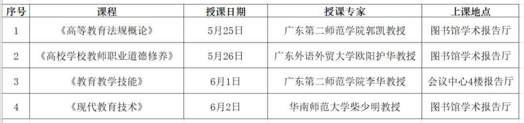 (二)《高等学校教师职业道德修养》、《高等教育法规概论》、《现代教育技术》和《教育教学技能》在校内培训,开课时间为2024年5月25日,具体课程安排如下。