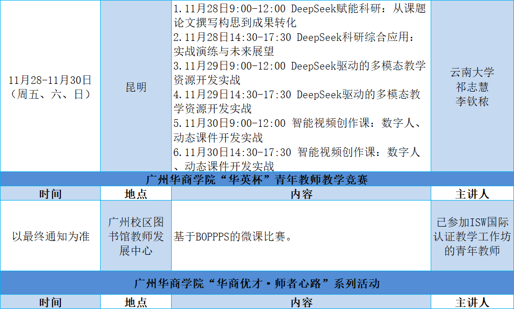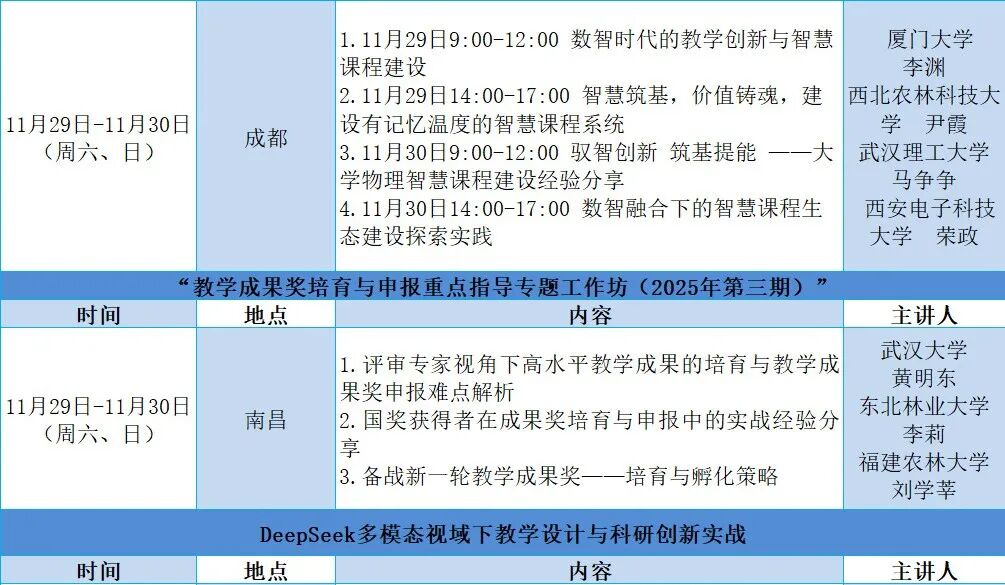 11 月教发活动来袭!有成都的智慧课程、南昌的教学成果奖指导、昆明的 DeepSeek 实战培训,还有 “华商有约” 下午茶、“师者心路” 分享、“华英杯” 竞赛等精彩活动,助力您全方位提升教育教学能力! (若有时间、地点变动,以最终通知为准) E