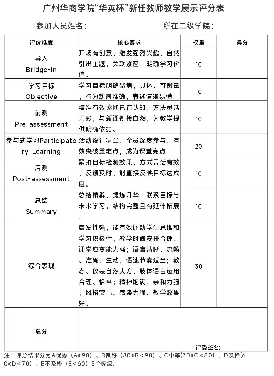 附件2:广州华商学院“华英杯”新任教师教学展示评分表