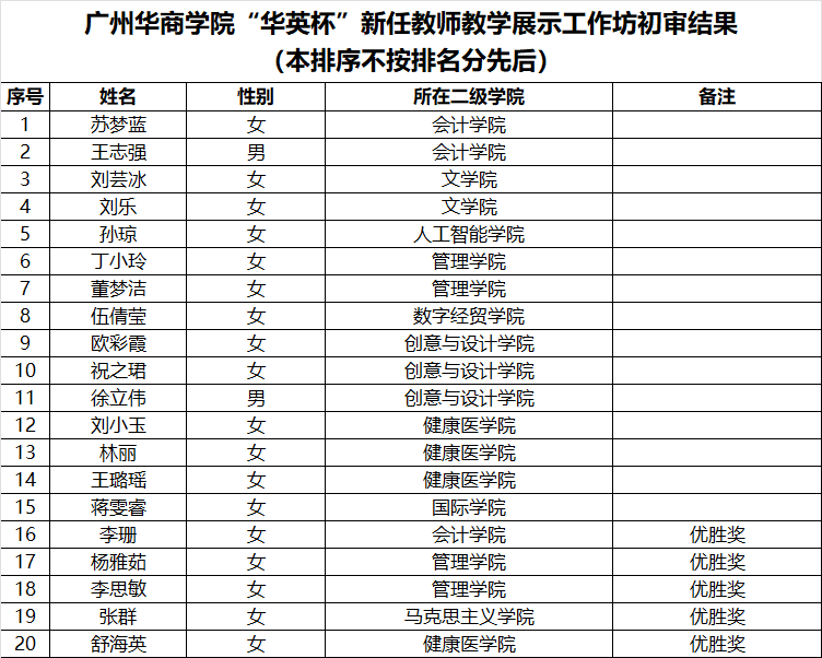 附件1:广州华商学院“华英杯”新任教师教学展示工作坊初审结果